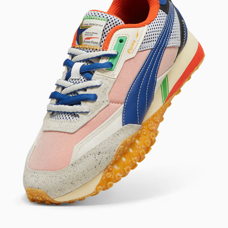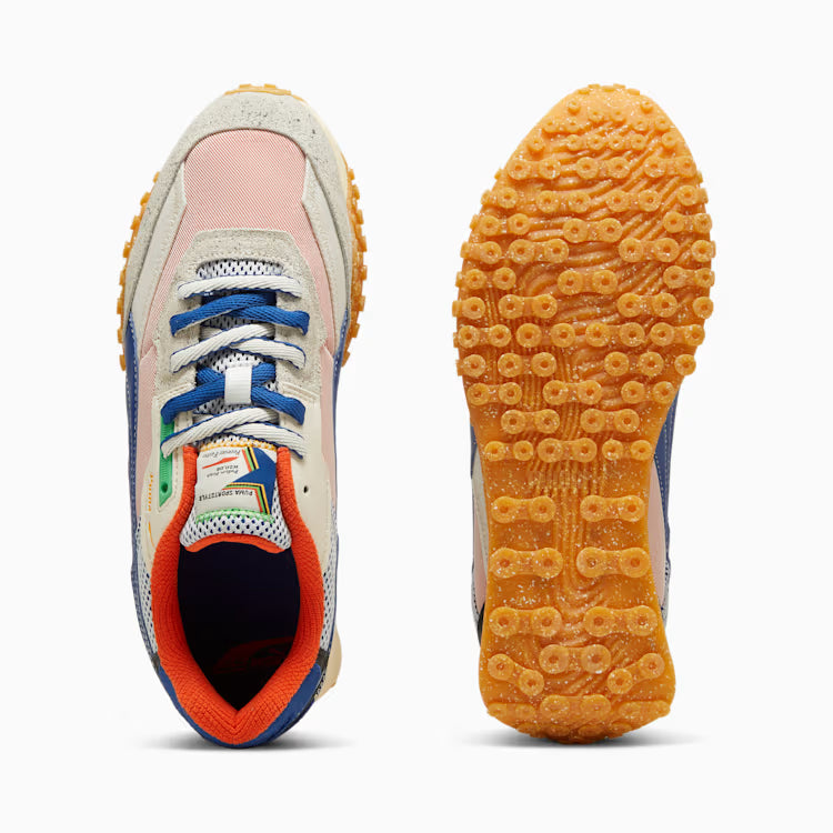 Meet the newest member of the PUMA Rider family, the Blktop Rider, in which heritage colours and materials meet modern design elements in this classic, yet new, silhouette. With this Podium version, which features bright, vibrant colours, vintage PUMA graphics, and track-inspired detailing, winning has never looked this good. Victory starts here.